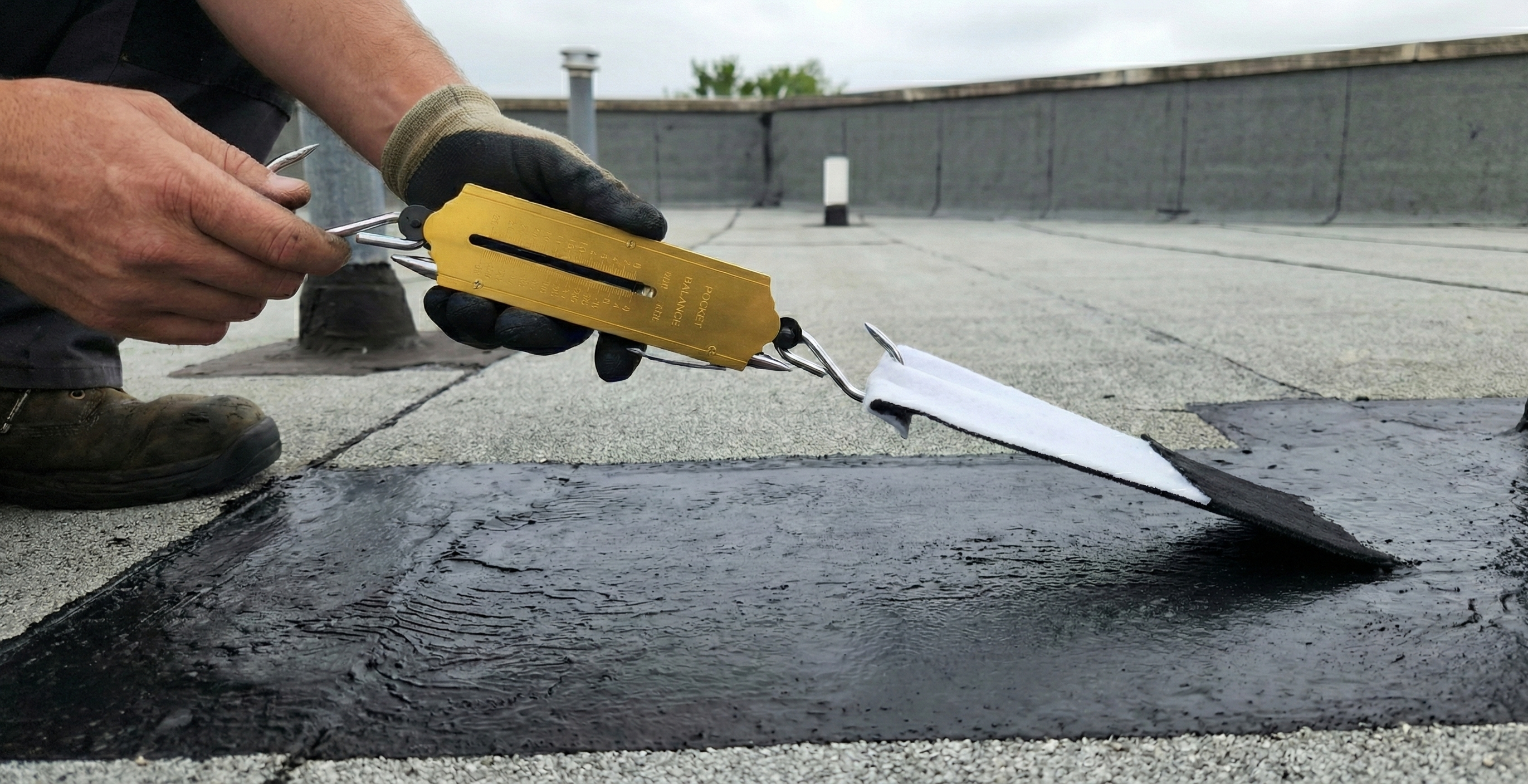- Minder dan 4 kg trekkracht: De hechting is onvoldoende of de ondergrond laat los (bijv. de toplaag van de bitumen scheurt mee). De ondergrond moet mogelijk eerst versterkt worden. Voor ons advies: stuur een foto/video van de dakbedekking naar info@sneldakherstel.nl
