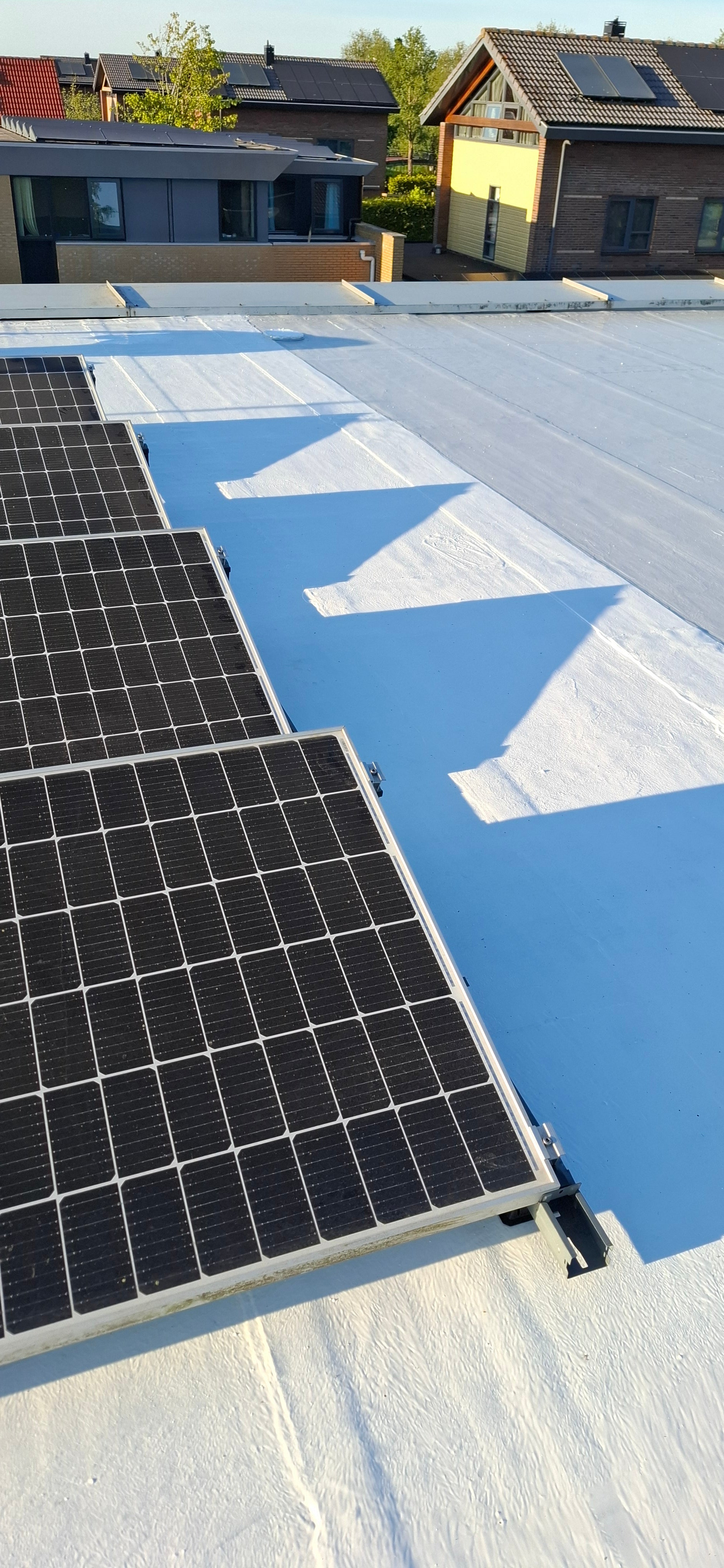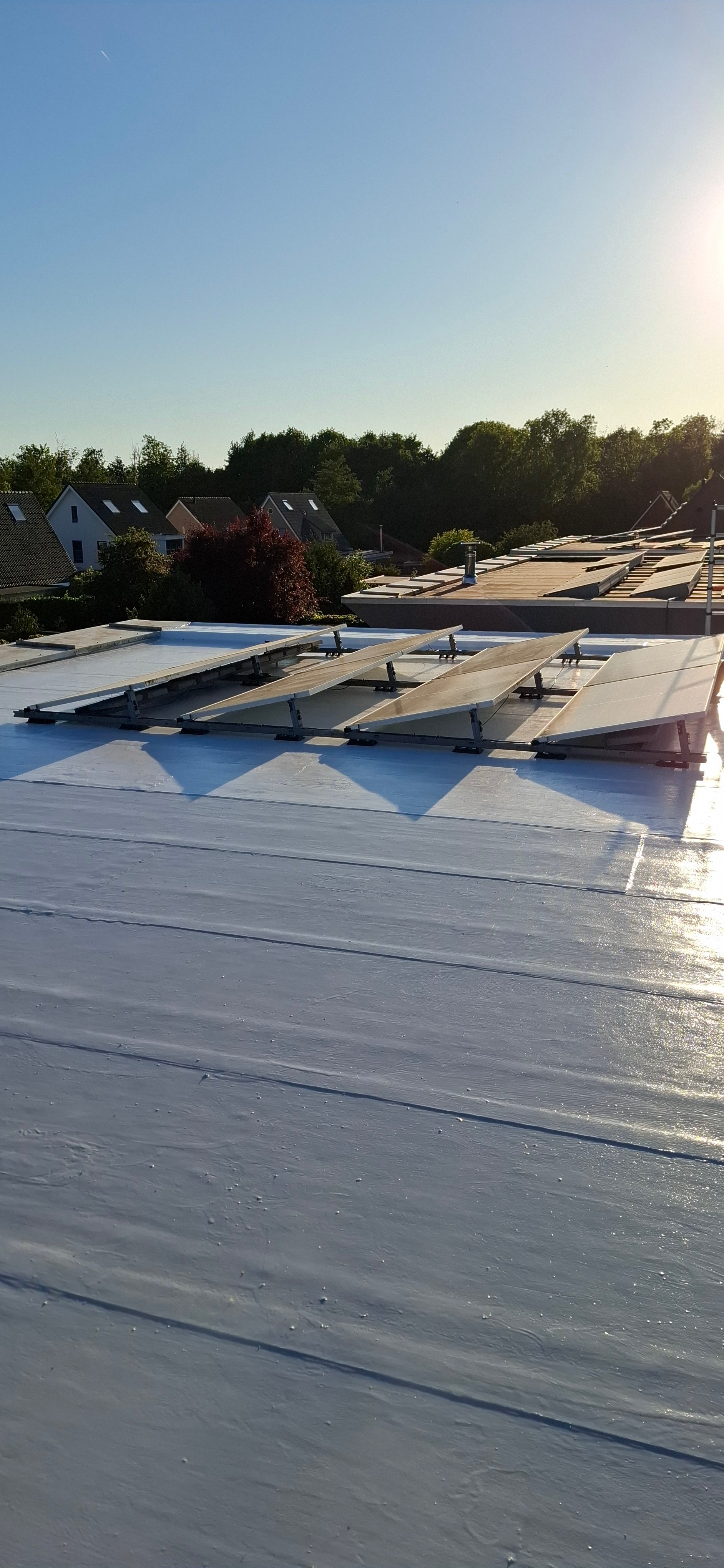 Dankzij de hoge reflectiewaarde van de witte dakbedekking, blijft het dak koeler, wat resulteert in een rendementstoename van circa 6% voor zonnepanelen en een langere levensduur.